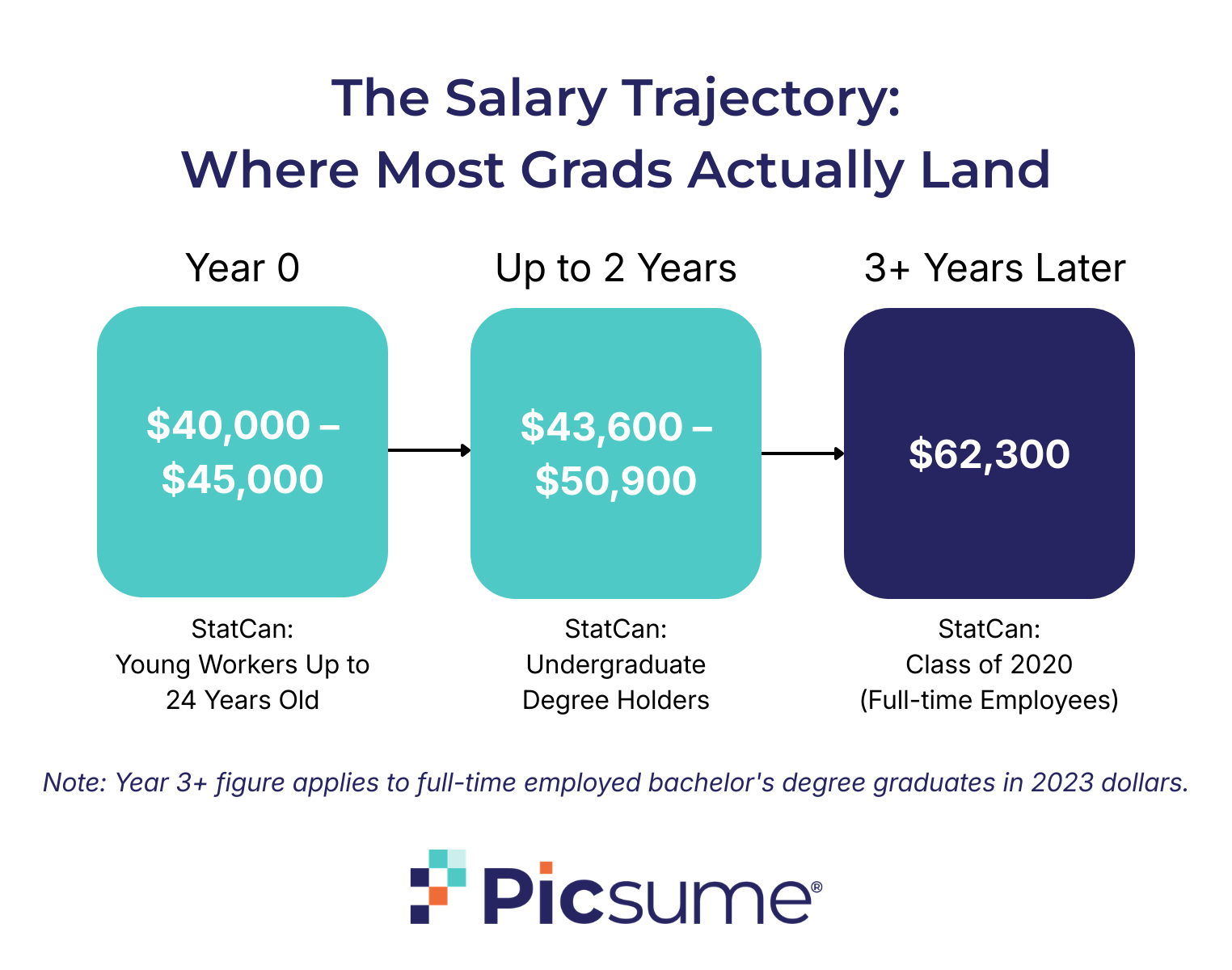 This is the part worth paying attention to. According to Statistics Canada's National Graduates Survey, the median income for full-time employed bachelor's degree graduates from the class of 2020 was $62,300 — measured three years after graduation, in 2023 dollars.